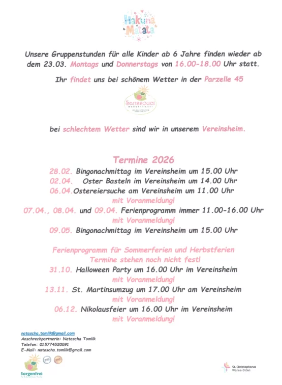 Unsere Gruppe "Hakuna Matata" hat zu folgenden Zeiten ihre Gruppenstunden: Montag und Donnerstag von 16.00 bis 18.00 Uhr.