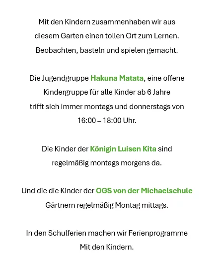 Mit den Kindern zusammen haben wir aus diesem Garten einen tollen Ort zum lernen, beobachten, basteln und spielen gemacht.