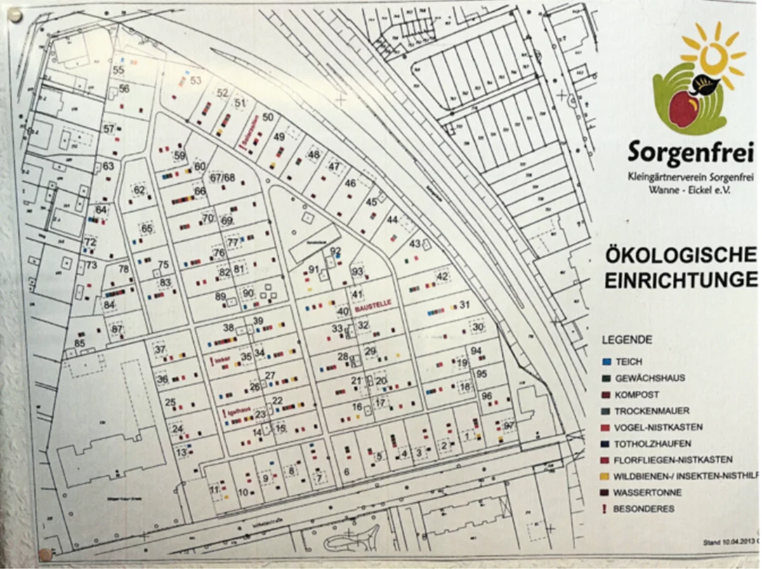 Unter diesem Motto haben die Mitglieder des Vereins den Auftrag, die Parzellen ökologisch zu bewirtschaften. Ein Lageplan von April 2013 zeigt die ökologischen Einrichtungen einzelner Parzellen.
